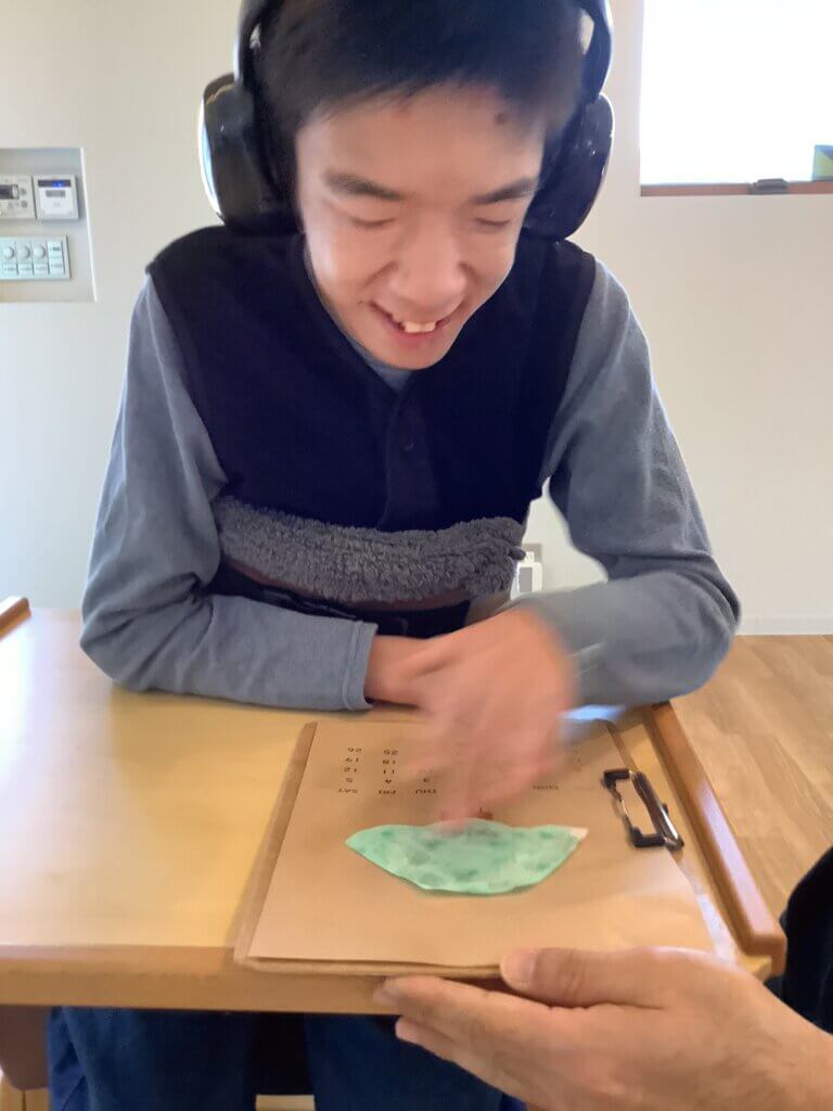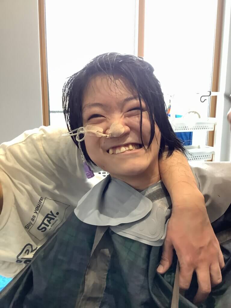 訪問美容師の方に来所していただき、散髪をしてもらったときの場面です。