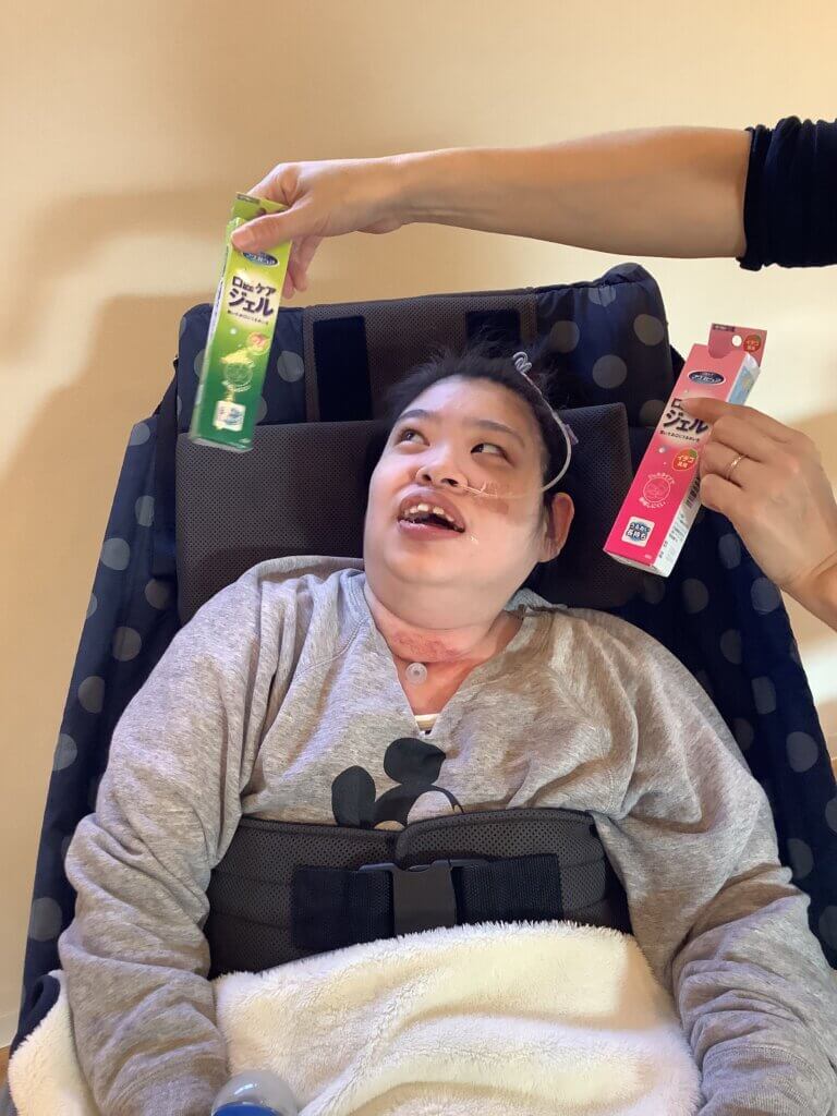 口腔ケア・口腔マッサージに使う保湿ジェルをご自身で選択してもらっているところです。