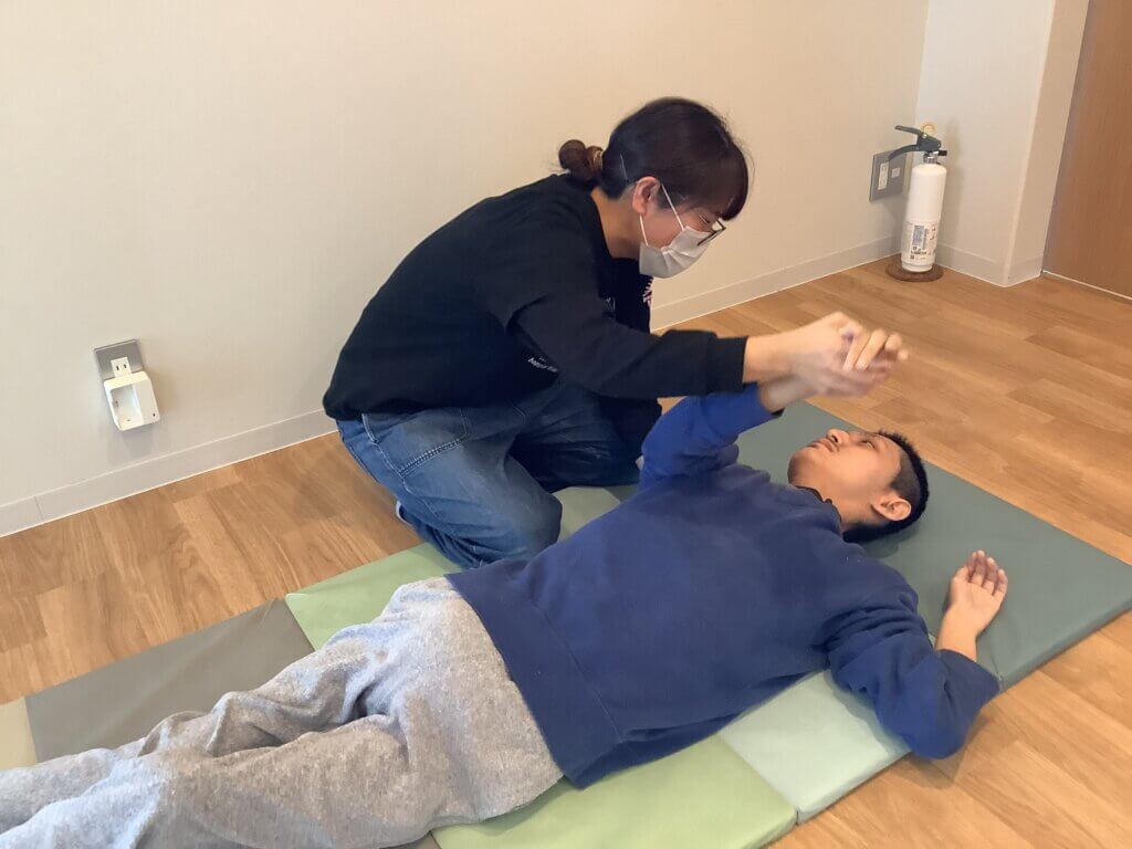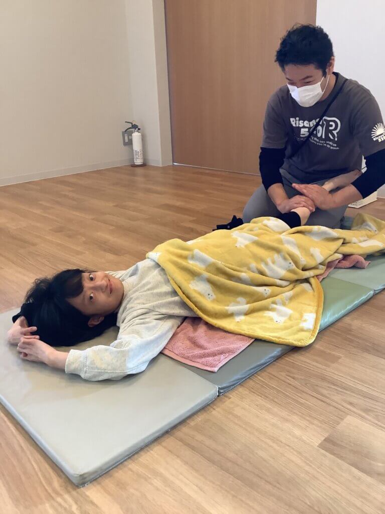 こちらは、理学療法士と一緒にマットに横になりしっかりと身体を伸ばしていきます。