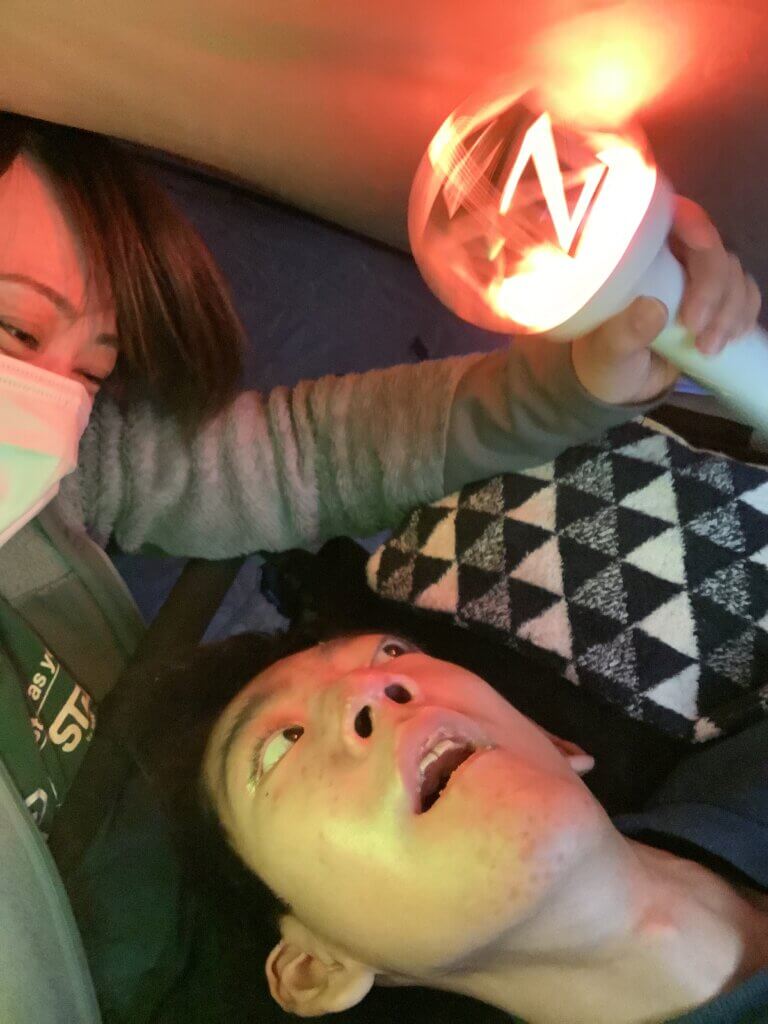 テントの中を締め切って、色々なライトをつけて光遊びをしました。